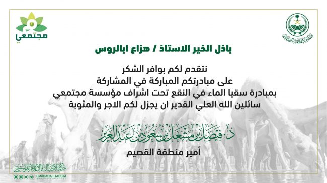سمو #امير_القصيم يشكر باذل الخير الأستاذ/ هزاع ابالروس لمبادرته المباركة في المشاركة بمبادرة سقيا الماء في النقع تحت اشراف مؤسسة #مجتمعي .