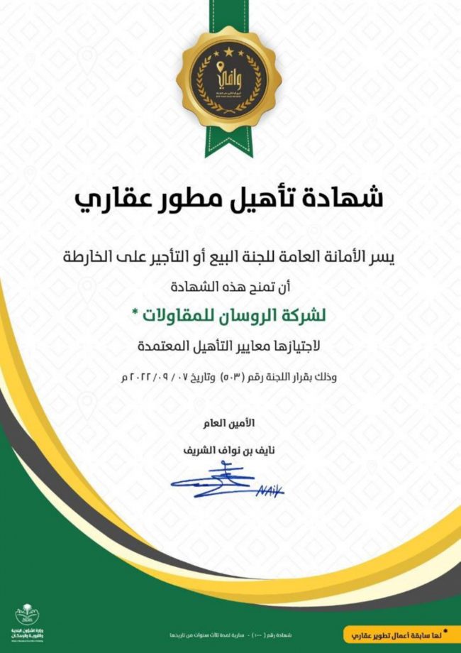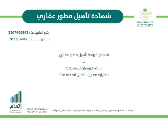 بفضل الله وتوفيقه: وزارة الشؤون البلدية القروية والاسكان تمنح #شركةـالروسان شهادة مطور عقاري بعد اجتياز المعايير المعتمدة