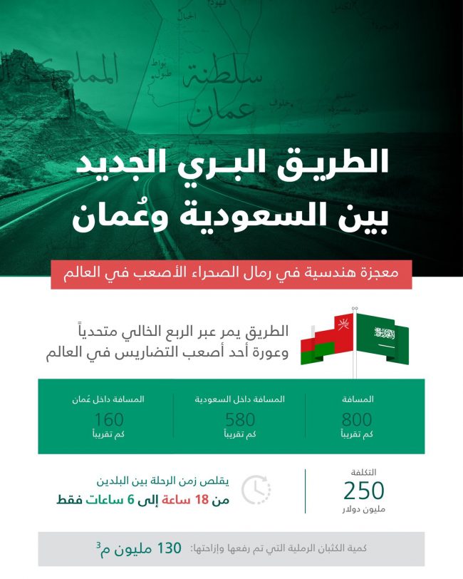 تستعد سلطنة عمان لفتح طريق بطول 680 كلم يربطها بالمملكة العربية السعودية، وهو الطريق الذي يختصر اكثر من 800 كلم من المسافة. وأشارت صحيفة ” تايمز أوف عمان ” إلى أنه يتم العمل بجهود كبيرة لفتح الطريق الذي يمر عبر اكبرغ صحراء في العالم تربطها بالسعودية، حيث تمت إزالة أكثر من 130 مليون متر مكعب…